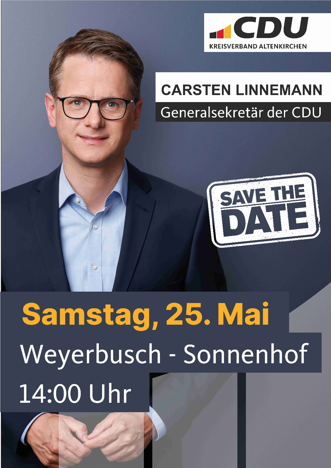 Auf Einladung des Westerwälder Europaabgeordneten Ralf Seekatz wird der Generalsekretär der CDU Deutschlands, Carsten Linnemann, am Samstag, dem 25. Mai nach Weyerbusch in den Sonnenhof kommen. Wenige Wochen, nachdem die CDU im Bund während ihres Parteitages ihr neues Grundsatzprogramm verabschiedet hat, wird der CDU-Generalsektretär um 14 Uhr in der Firma Hottgenroth-Software erwartet, die im Rahmen des „Tag der offenen Tür“ für alle Interessierten ihre Pforten geöffnet haben wird.