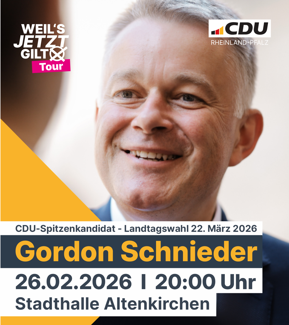 Herzliche Einladung am Donnerstag, 26.02. nach Altenkirchen - Im Rahmen seiner landesweiten „Weil’s jetzt gilt“-Tour kommt der CDU-Spitzenkandidat für die Landtagswahl am 22. März, Gordon Schnieder, am Donnerstag, 26. Februar 2026, um 20:00 Uhr in die Stadthalle Altenkirchen.