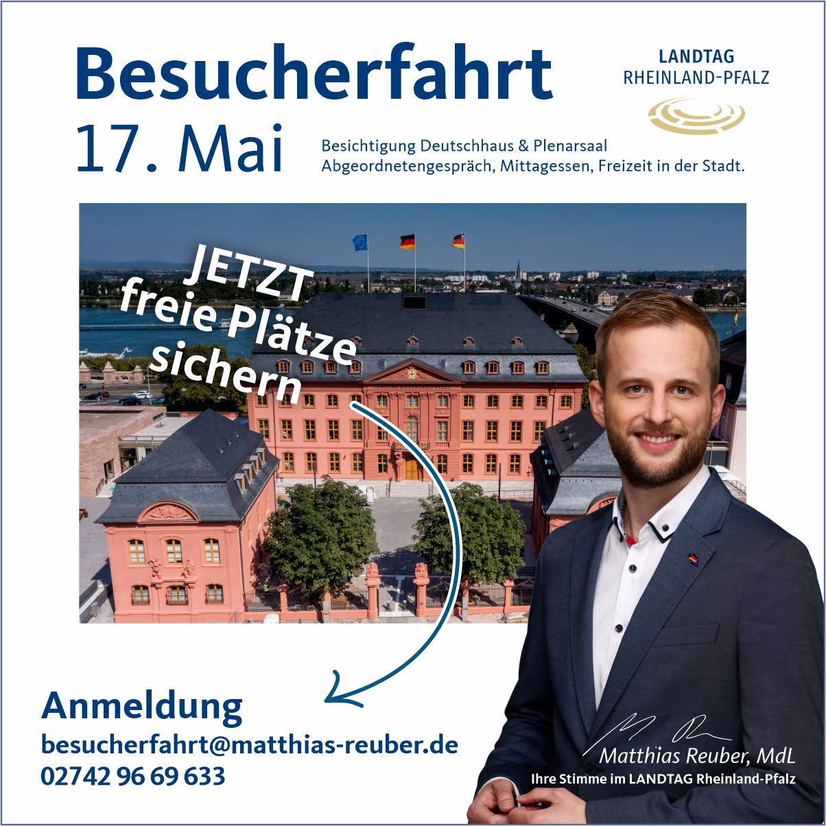 Bei Interesse schreiben Sie uns am besten eine Nachricht an besucherfahrt [at] matthias-reuber.de oder nehmen telefonisch Kontakt auf. Telefon: 02742 / 9669633. Wir informieren Sie gerne über weitere Details der Fahrt.