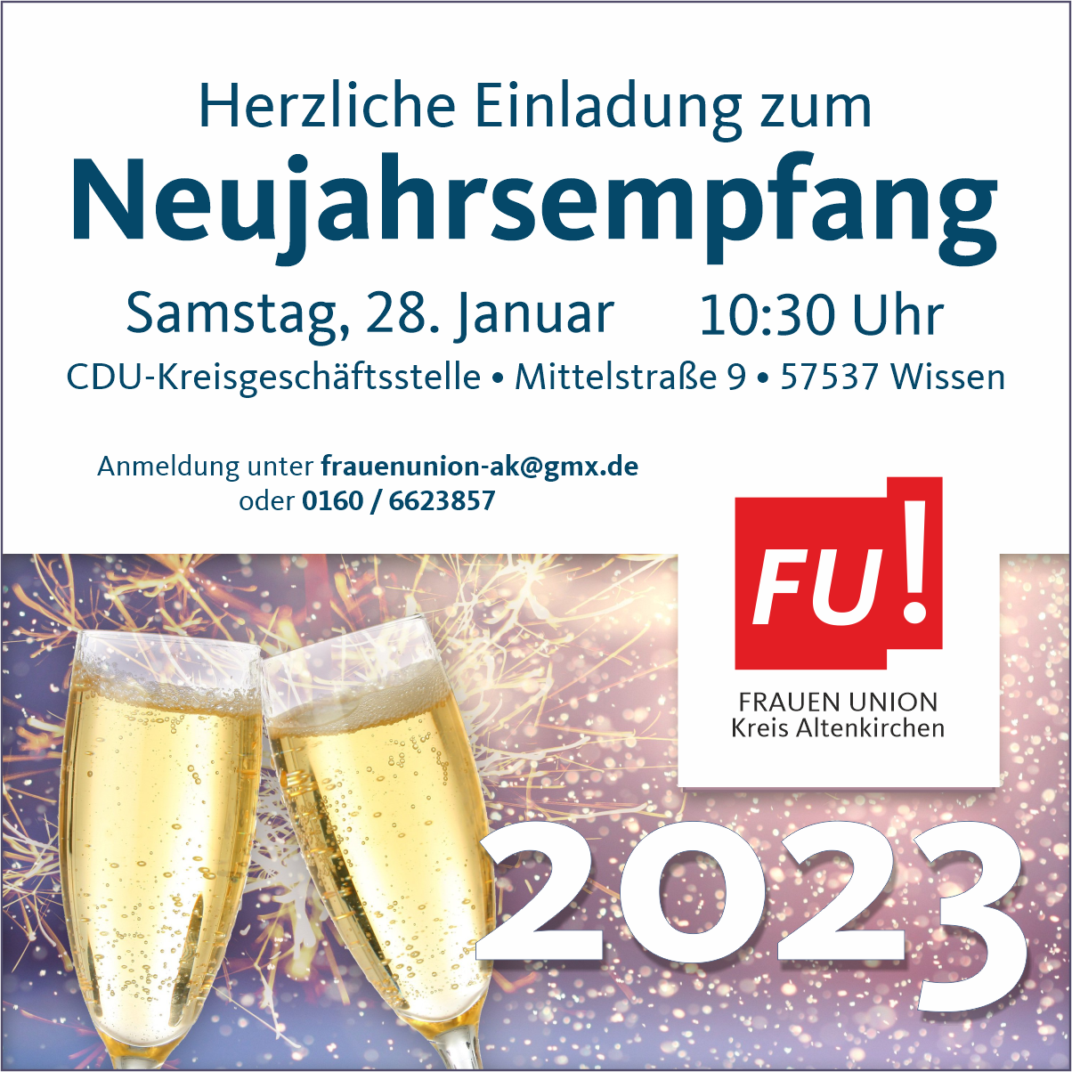 Als Grundlage für angeregte Gespräche laden wir zu einem Neujahrssekt und einem kleinen Imbiss ein. Wir würden uns freuen, Euch begrüßen zu dürfen, um auf ein erfolgreiches Neues Jahr anzustoßen!