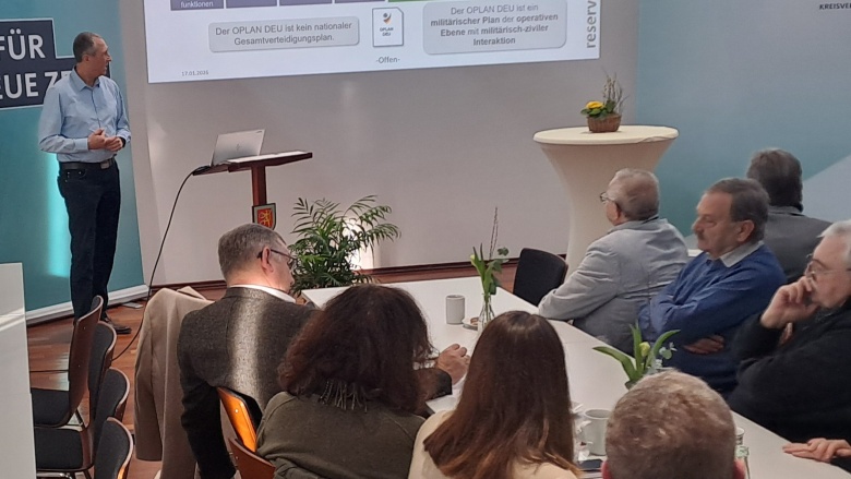 In seiner Präsentation machte er deutlich, wie sehr sich das sicherheitspolitische Umfeld in den vergangenen Jahren verändert hat: Deutschland ist heute eine zentrale Drehscheibe für die Bündnisverteidigung, zugleich wachsen die Herausforderungen durch hybride Bedrohungen, Cyberangriffe und globale Krisen. Klar wurde auch: Sicherheit beginnt nicht abstrakt, sondern betrifft Staat, Gesellschaft und jeden Einzelnen – Resilienz und Verantwortung gehen dabei Hand in Hand.